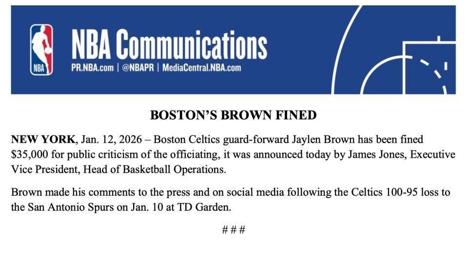 北京时间1月13日,NBA官方宣布,波士顿凯尔特人球员杰伦-布朗因公开批评裁判,被处以35000美元罚款。布朗是在1月11日凯尔特人于TD花园球馆以95-100不敌马刺的赛后,向媒体及社交媒体发表了相关言论。